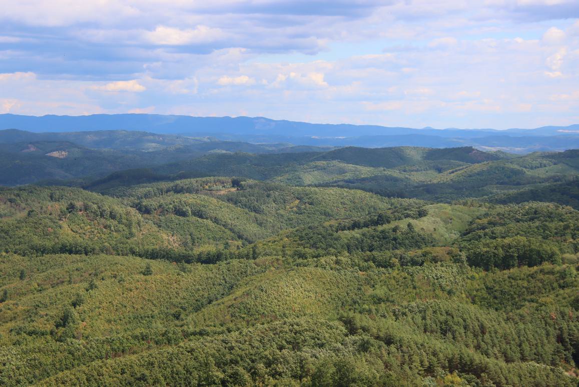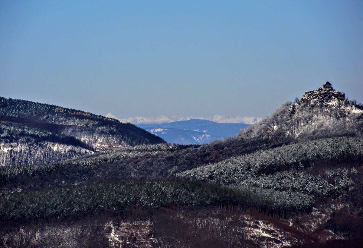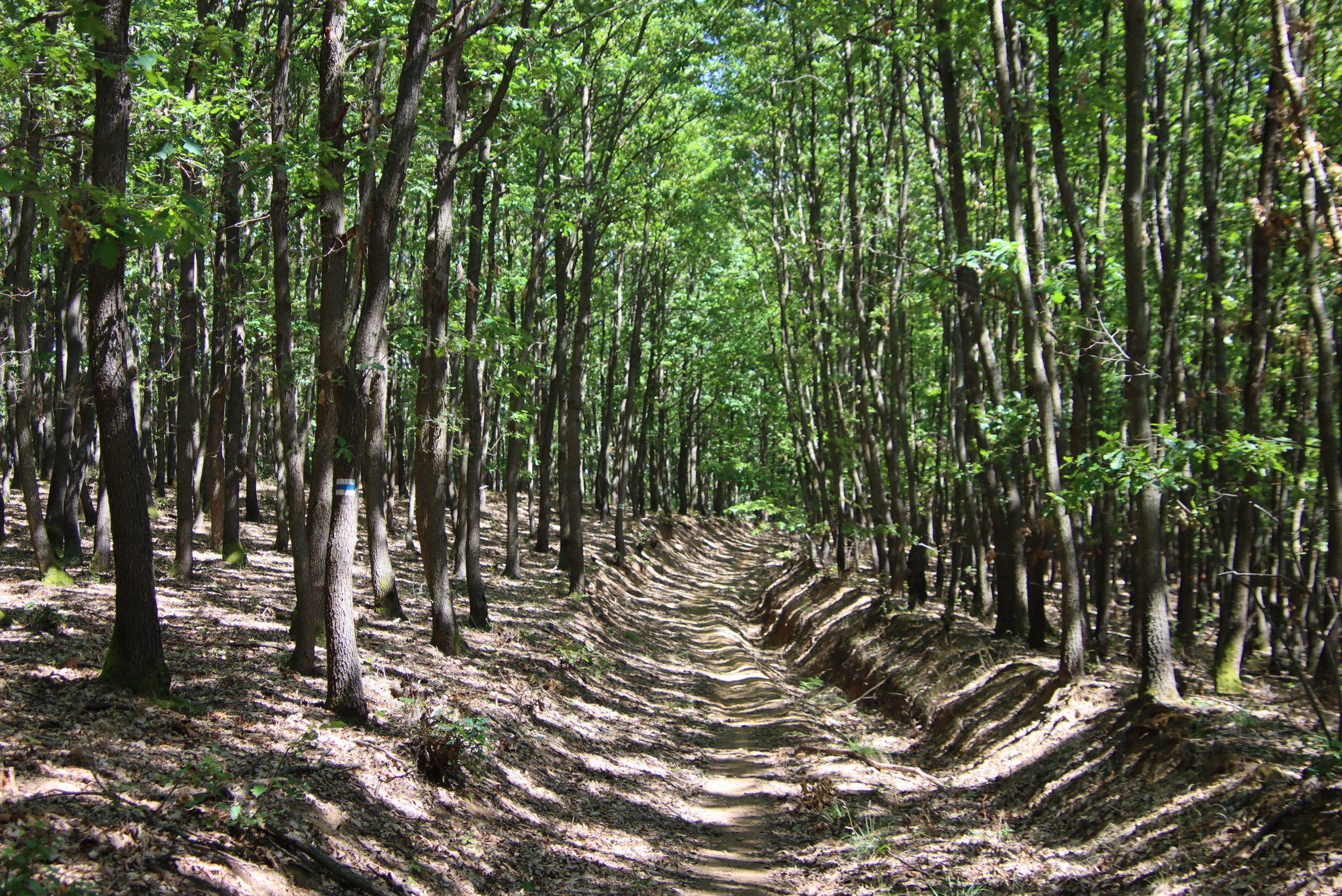 Ez egy elég hosszú szakasz lesz, és mivel jobbra ki vannak vágva a fák, meglehetősen napos is, már ha derült időnk van. Kárpótlásként szép kilátás nyílik a Mátrára. Láthatjuk a Kékes és a Galya-tető tornyait.