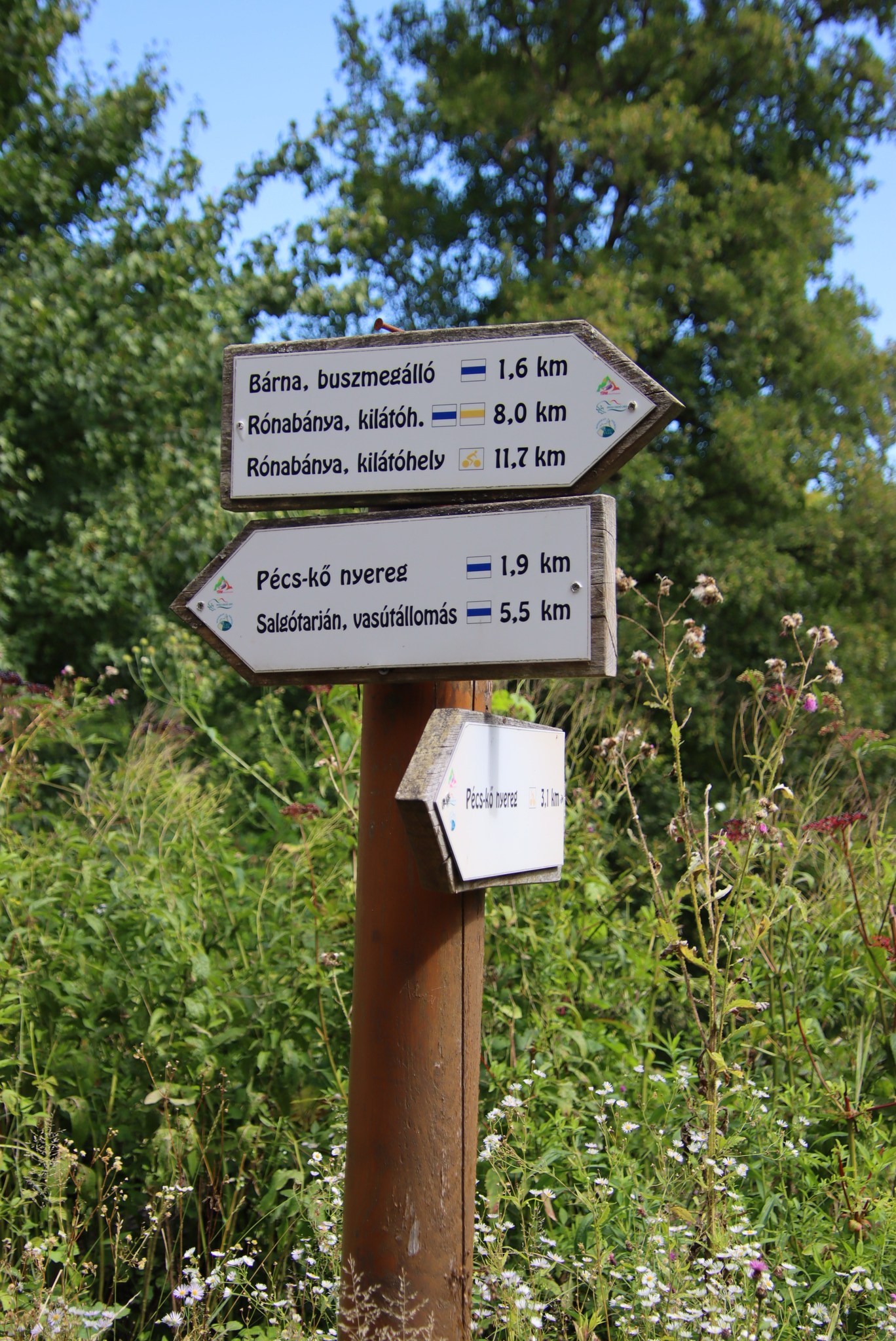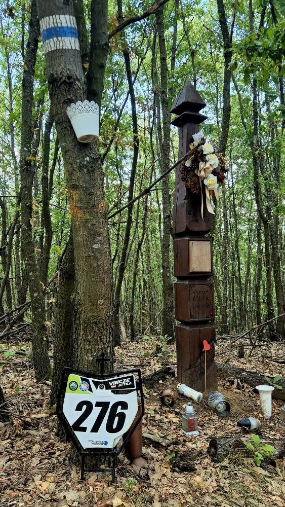 Figyelem, egy időnként majdnem járatlan utat keressünk erősen benőve fűvel és csalánnal! A jelzés a magas fű miatt nehezen vehető észre a fán, de ott lesz az.