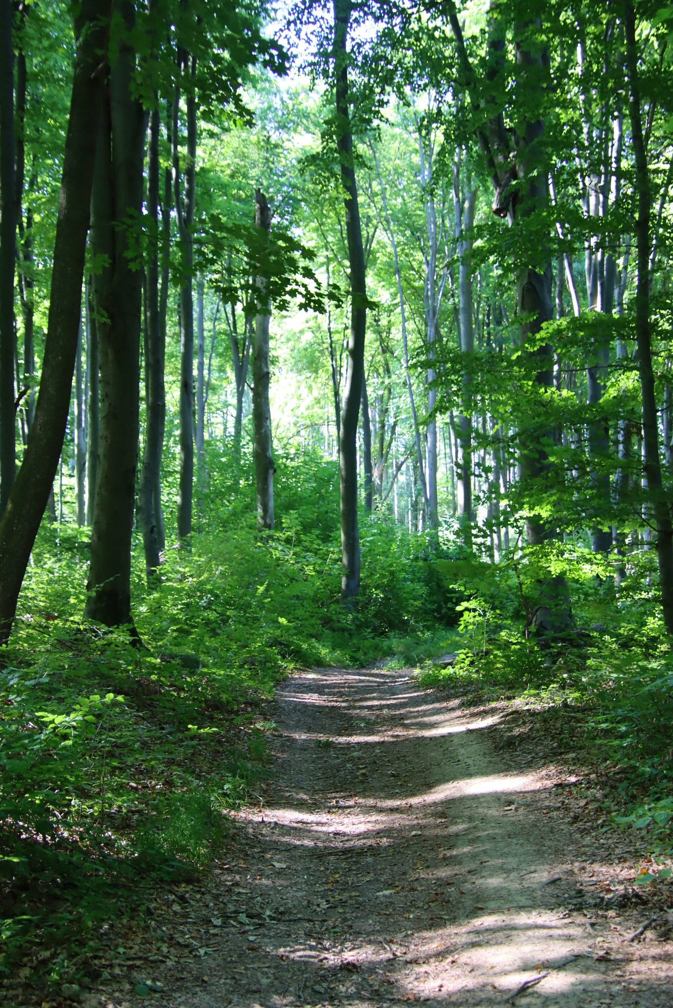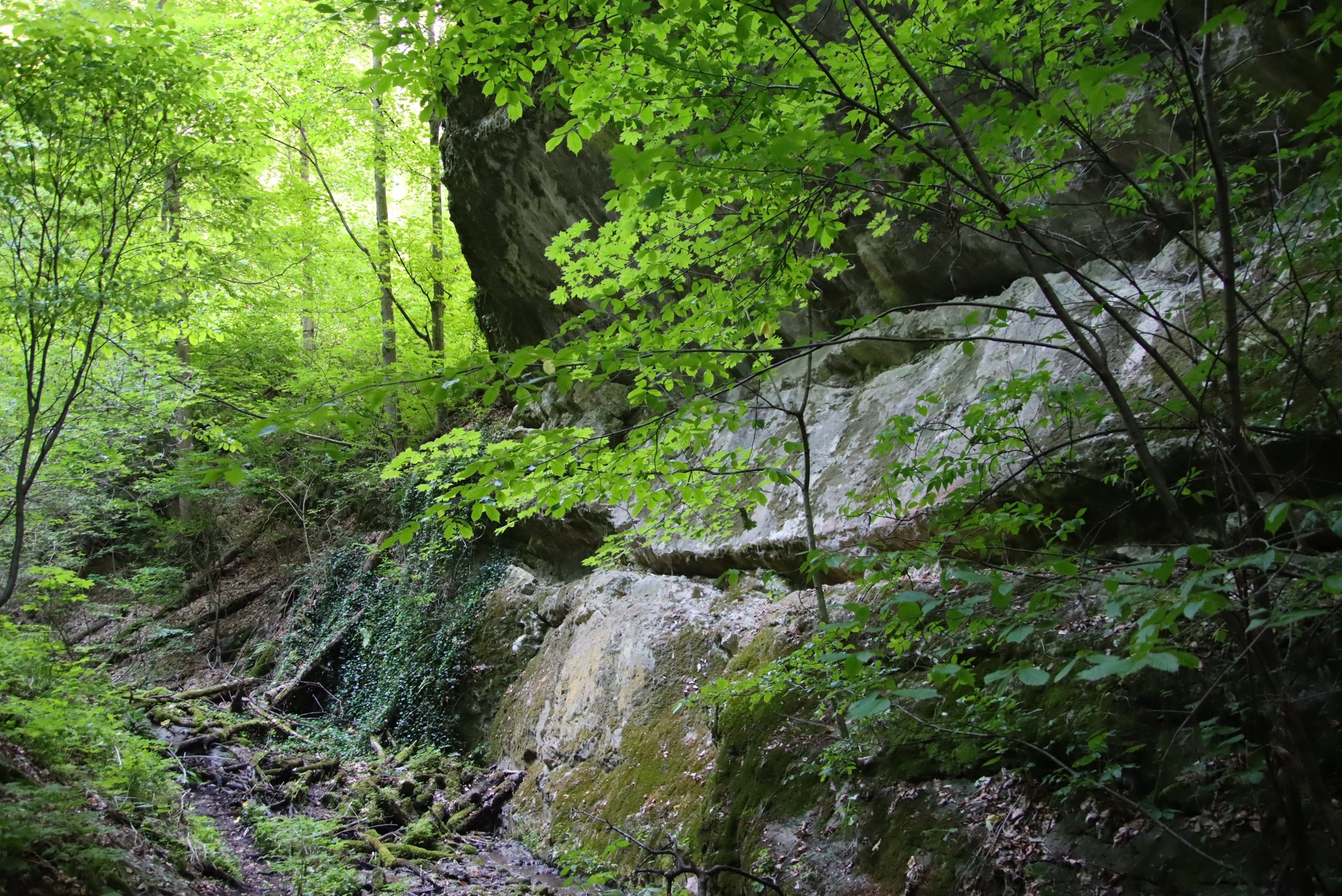 Fiatalos, árnyas erdőben enyhén emelkedünk. Itt az utunk igencsak meredekké válik. Borostyánnal befutott bükkfánál enyhén balra tartva haladunk egészen a legmagasabban látható lábas erdőig. A tetőn tovább egyenesen enyhén lejt az utunk. Erős balkanyarral megkerüljük a völgyfőt, (jobb oldali sziklafalon K+ jelzés). Ez után nagyon kell figyelni, mert a széles dózer útról a jobb kanyar előtt FELFELÉ kell kanyarodnunk egy ÖSVÉNYRE, ami meglehetősen füves.