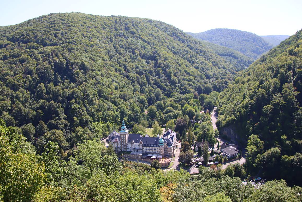 Lillafüreden jobbra tartunk a Kastélyszálló felújított függőkertjébe, majd az Anna-barlangnál balra kanyarodunk a villanyoszlop gyámján lévő K+ jelzés felé.